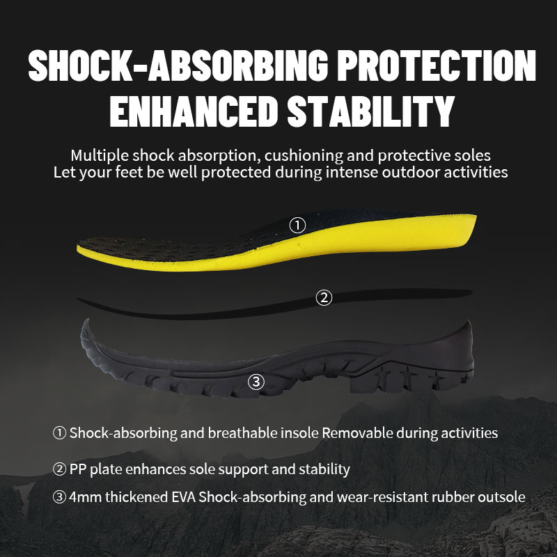 ①쿠션이 있고 통기성이 좋은 깔창 - 청소하거나 교체해야 할 때 제거 가능합니다.② 발 밑을 추가로 지지하기 위해 PP 플레이트로 강화되어 모든 발걸음이 견고하고 제어되는 느낌을 줍니다.③4mm 두꺼운 EVA 충격 흡수 및 내마모성 고무 밑창.