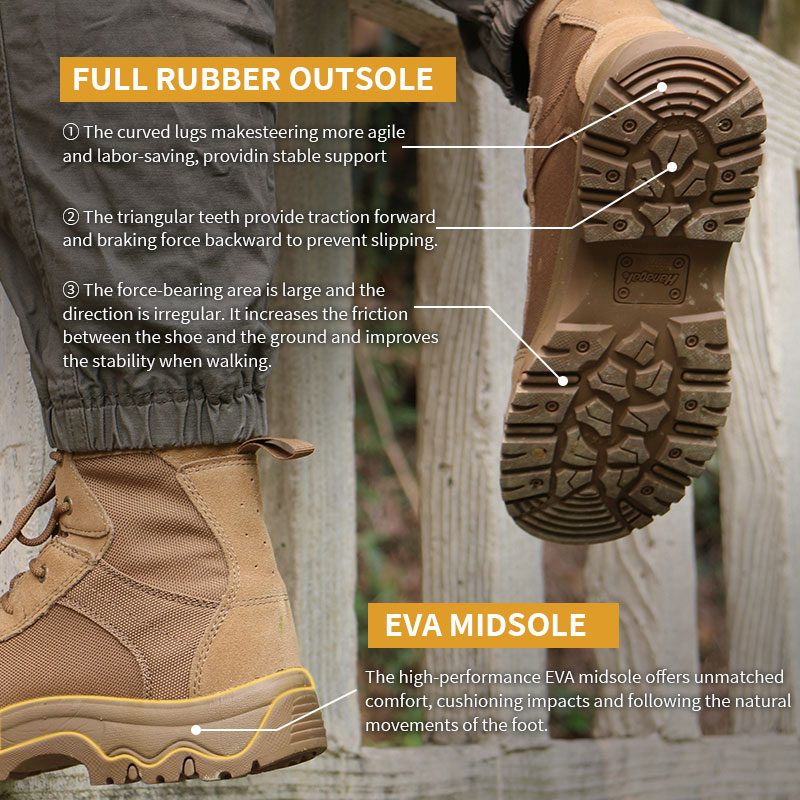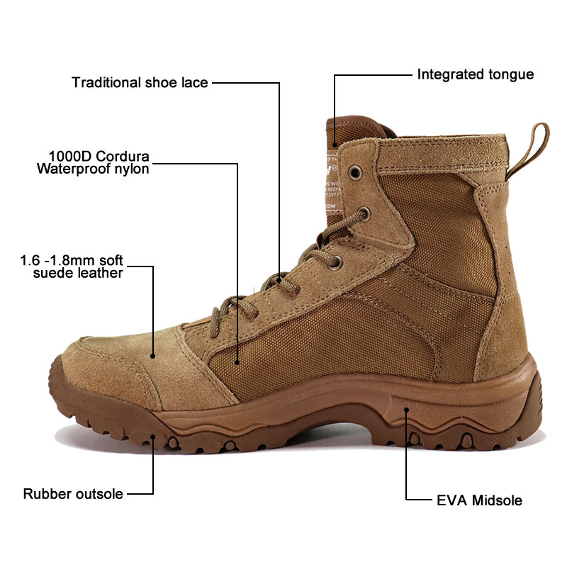 바위가 많은 와디부터 느슨한 모래 언덕까지, Cordura 패브릭 고무 사막 전술 부츠는 성능을 발휘하도록 설계되었습니다. 내구성이 뛰어난 Cordura 갑피는 무게를 줄이면서 마모에 강하고, 다방향 고무 밑창은 예측할 수 없는 사막 표면에서도 안정적인 발판을 제공합니다. 자세한 내용은 문의해 주세요.