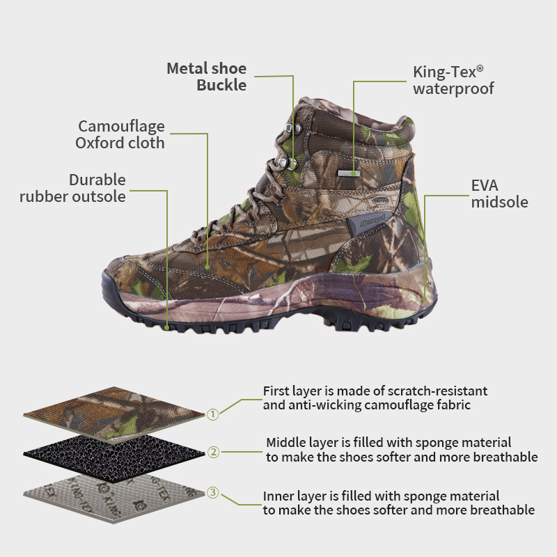 Kingtex 방수 멤브레인 헌팅 부츠는 재고가 있으며 배송 준비가 되어 있으며 주문은 단 10켤레부터 시작됩니다. 자세한 내용이나 가격문의는 언제든지 편하게 연락주세요. 최소 800쌍 이상 주문 시 맞춤 제작도 가능합니다. 이 모델은 다음과 같은 장점이 있습니다.