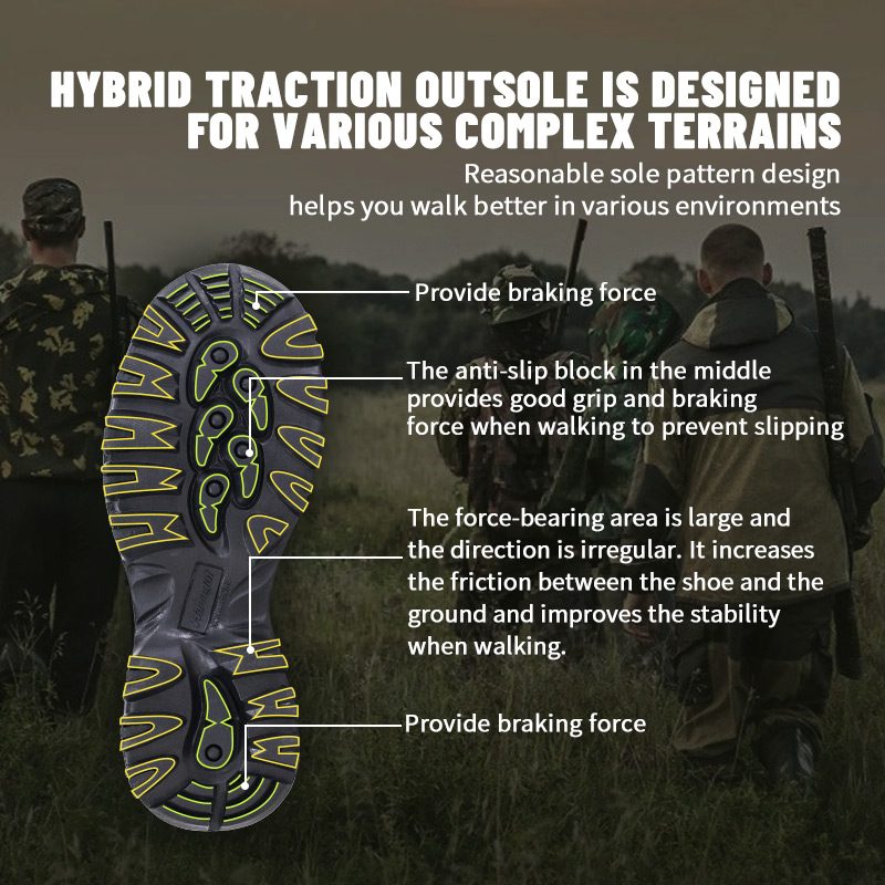 ①폴리유 고신축성 흡습 깔창은 내부를 건조하게 유지합니다.② EVA 미드솔, 위장 천으로 감싸 쿠션 및 충격 흡수.③ 내구성이 뛰어난 고무 밑창, 미끄럼 방지 및 내마모성.