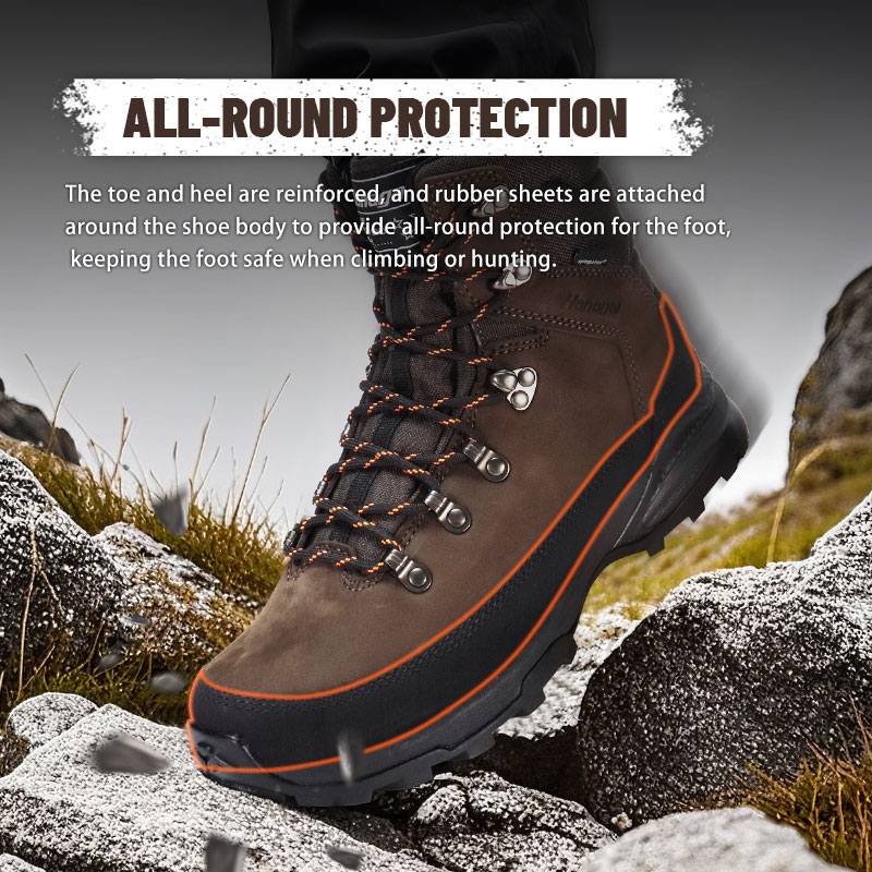 발가락과 발뒤꿈치가 강화되었으며 신발 본체 주위에 고무 시트가 부착되어 발을 전반적으로 보호해 등산이나 사냥 시 발을 안전하게 유지합니다.