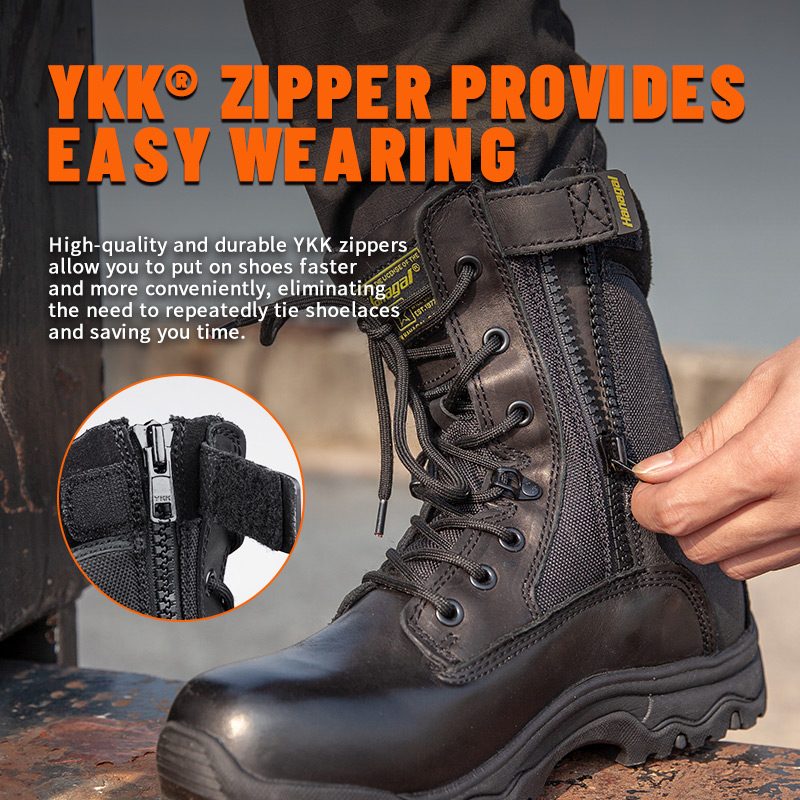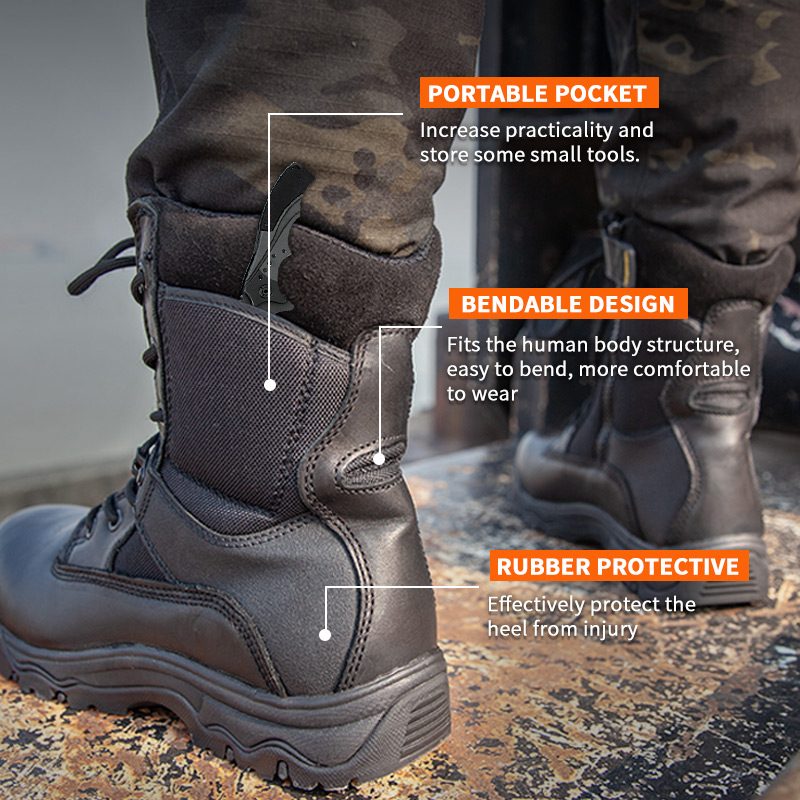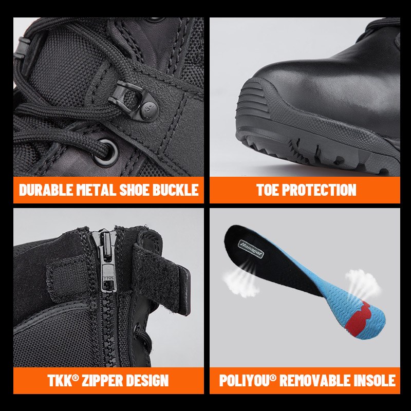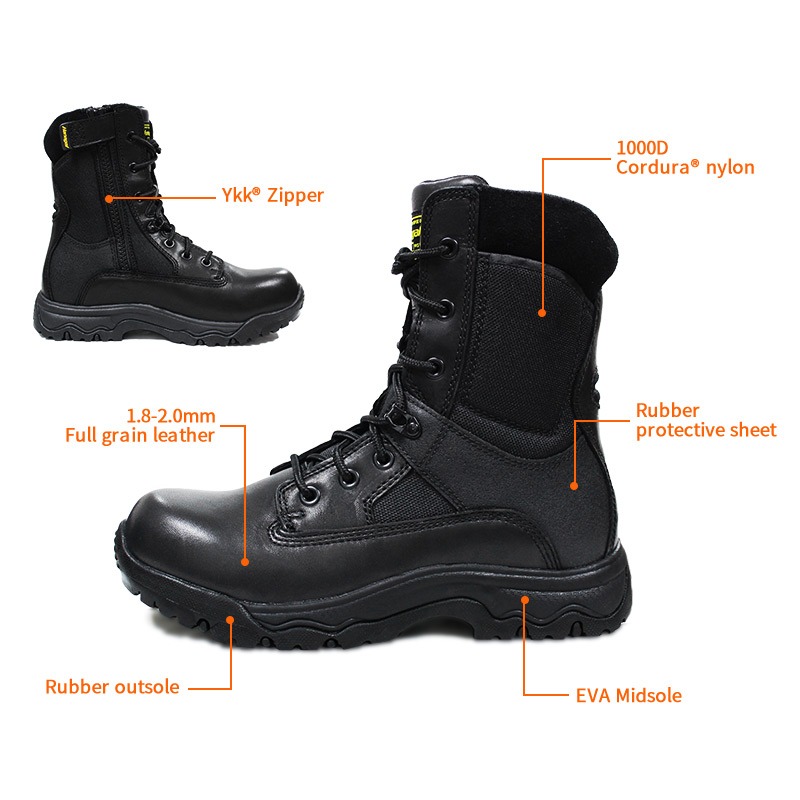 이 YKK 지퍼 풀 그레인 가죽 경찰 부츠는 색상, 소재 및 세부 사항을 맞춤 설정할 수 있으며 MOQ는 800켤레로 브랜드 협업 및 그룹 조달에 이상적입니다. 그리고 이 사냥용 부츠에는 다음과 같은 장점이 있습니다.